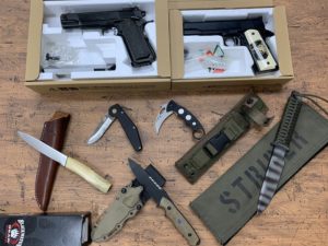 リピータの方よりお依頼を頂きました。 今回は前回に続き、ナイフとエアガンを2~5点ずつ程。 ナイフでは今なお高い人気を誇るストライダーのモデル MTの初期デザイン、 その他GTナイフ、ブラック…
